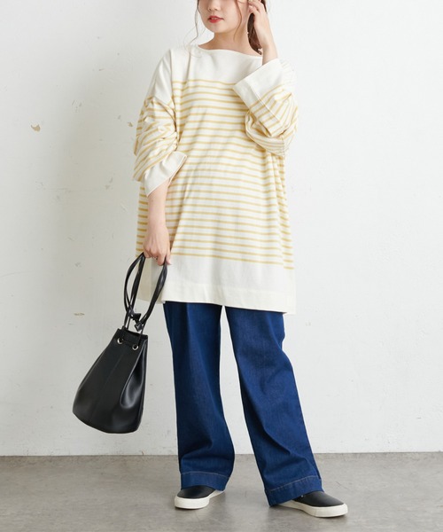 ピュアルセシン 2021 autumn&winter collection【sophisticated retro】 ◇ナチュラルなカラフルトーンな、ボーダーチュニック◇ ●同シリーズ、セーラーカラーバージョンあり(no:246620030) ●デザイン 今季大注目のボーダーから、 柔らかいカラートーンが秋冬に向けて気分の上がるチュニックが登場。 ほどよい厚みのコットン素材でオールシーズン着用できるベーシックアイテム。 ワイドな身幅と肩の落ちたドロップショルダーのこなれた雰囲気。 首がすっきり見えつつ詰まり感のない、やや湾曲したボートネックや ゆったりとしたロングスリーブが特徴。 身体が泳ぐビッグシルエットなサイズ感を楽しんで頂けます。 ●カラー展開 グレー/ブラウン/グリーン/イエロー/ピンク 5色展開 ●素材 ソフトな肌触りなコットン100%素材。 ●スタイリング 一枚でシンプルなスタイリングを楽しんだり、 襟のあるブラウスなどを重ねたレイヤードスタイルを楽しめるのも 首元が無地である、パネルボーダーならではの着こなしでおすすめです。 カジュアルボトムと合わせてラフなスタイルや、 フェミニンなスカート合わせで女性らしさをプラスするコーディネートもおすすめです。 =============================== 透け感:なし 裏地:なし 伸縮性:あり 光沢感:なし 生地の厚さ:普通 【スタッフコメント】 年齢:30代前半/身長:155cm/普段着用サイズ:Mサイズ サイズ感:体が泳ぐワイドシルエットでラフな着心地。お尻がすっぽり隠れる丈感で安心感があります。 素材感:柔らかくソフトな肌触りです。 =============================== ※撮影場所やお使いのモニター環境により若干お色味が異なる場合がございます。特にロケの撮影では明るく見える傾向にございます。 ※予約商品はサンプルで撮影をしております。若干の仕様が変更になる場合がございますので予めご了承の上ご注文くださいますようお願いいたします 。