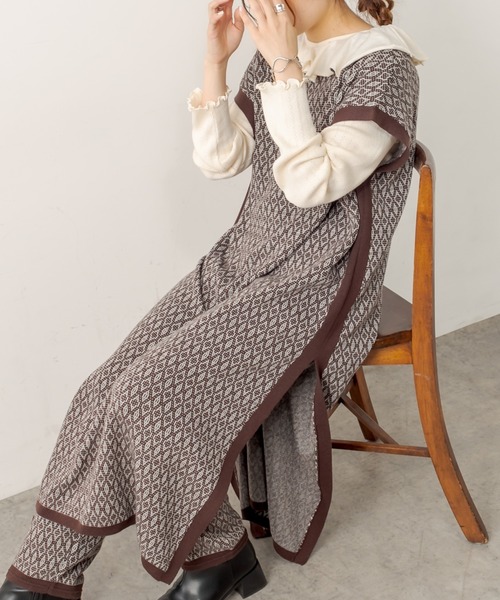 ピュアルセシン 2021 autumn&winter collection【sophisticated retro】 ◇トレンドライクなコーデが楽しめるニットワンピース◇ ●デザイン シーズンムード高まるジャガードニットワンピースが登場。 バイカラーのジャガード織りがモダンで、インパクトのある着こなしを叶えます。 肩にかかるゆったりシルエットでリラクシーな着心地。 両サイドにはスリットを入れて、動きやすさとデザイン性をプラスしました。 ●カラー展開 秋らしいブラウン、ネイビー、スミクロの3色展開。 ●素材 アクリルとコットンの混合素材は柔らかく、滑らかな肌触りなので着心地抜群です。 薄手のニット素材なのでインナー次第で長く着回すことができます。 ●スタイリング キレイめなブラウスやカジュアルなTシャツなど、どんなアイテムとも相性抜群。 テーパードパンツやスウェットパンツなど細身のパンツが◎ 同素材のパンツ(No.248510110)とセットで着こなすのもオススメです。 =============================== 透け感:なし 裏地:なし 伸縮性:あり 光沢感:なし 生地の厚さ:普通 【スタッフコメント】 年齢:20代前半/身長:152cm/普段着用サイズ:Mサイズ サイズ感:152cmでくるぶし上程の丈感です。着られた感なくスッキリと着れました。 素材感:滑らかで素肌に触れてもチクチク感なく、ストレスフリーに着れました。 =============================== ※撮影場所やお使いのモニター環境により若干お色味が異なる場合がございます。特にロケの撮影では明るく見える傾向にございます。 ※予約商品はサンプルで撮影をしております。若干の仕様が変更になる場合がございますので予めご了承の上ご注文くださいますようお願いいたします 。