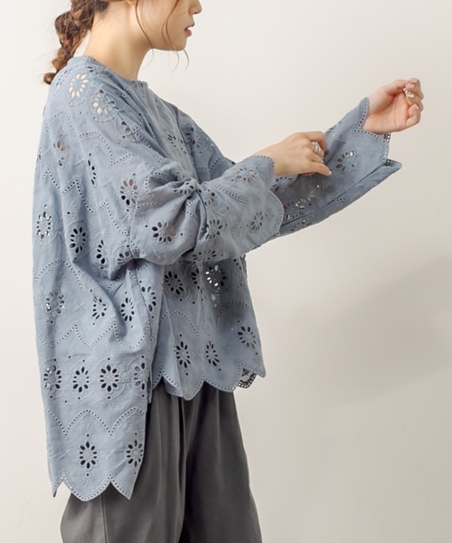 ピュアルセシン 2021 autumn&winter collection【sophisticated retro】 ◇大人ナチュラルなスタイリングが叶うレースブラウス◇ ●デザイン 袖口と裾に施されたスカラップレースと透け感のある生地で、華やかさと女性らしさを兼ね備えたブラウス。 全面に施されたカットワーク刺繍はパッと目を惹きます。 肩の落ちるドロップショルダーが抜け感を演出。 バックは、後ろボタン仕様なので後ろから見た姿もサマになります。 前後差のある丈はパンツからスカートまで、どんなボトムともよく馴染んでくれます。 ●同素材でパンツあり(NO:241510070) ●カラー展開 グレイッシュベージュ/ブルーその他/ブラック 秋冬を感じる3色展開です。 ●素材 コットン100%。 やや薄手の生地にカットワーク刺繍が施されているのでしっかりとした生地感です。 透け感はあるので、インナーが必要。 ●スタイリング 前後差のある丈なので、ボリューム感のあるボトムスから、 すっきりシルエットなボトムスまで、様々なボトムスと好バランスに着こなして頂けます。 気温が高い日は、キャミソールのインナーを合わせて清涼感たっぷりと。 肌寒くなってきたら、長袖インナーを合わせて雰囲気チェンジが可能。 総刺繍生地に、ドロップショルダーの袖なので 肉厚なインナーを合わせても、纏まり感のあるスタイリングが完成されます。 秋冬らしいダークトーンなカラー展開なので 晩夏までは、ホワイト系のボトムスで爽やかに、 秋~は、チャコールやブラック等の濃色ボトムス、 コーデュロイ素材アイテムを合わせると季節感の違いも楽しめます。 同素材のパンツ(No.241510070)と合わせてオールインワンライクな着こなしもオススメ◎ =============================== 透け感:あり 裏地:なし 伸縮性:なし 光沢感:なし 生地の厚さ:やや薄手 【スタッフコメント】 年齢:20代前半/身長:156cm/普段着用サイズ:Mサイズ サイズ感:身体のラインを隠してくれる、ゆったりとしたサイズ感。 スカラップレースで手元まで可愛く仕上げてくれます。 素材感:コットン100%の柔らかい素材感。軽い着心地です。 =============================== ※撮影場所やお使いのモニター環境により若干お色味が異なる場合がございます。特にロケの撮影では明るく見える傾向にございます。 ※予約商品はサンプルで撮影をしております。若干の仕様が変更になる場合がございますので予めご了承の上ご注文くださいますようお願いいたします 。