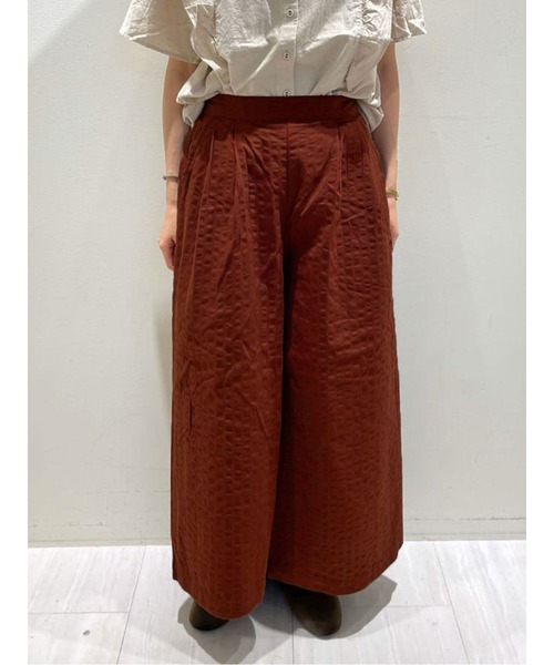 シャドーチェックが上品なアクセントに映えるパンツ。ゆとりのあるワイドシルエットで気になるレッグラインも優しくカバー。ウエストは後ろゴム仕様で穿き心地もノンストレスです。落ち着いたカラーでコーディネートにも取り入れやすく、デイリーユースにも活躍してくれるアイテム。