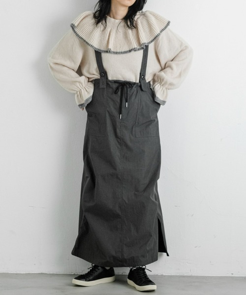 【取り外し可能なベルトで雰囲気が変わるジャンパースカート】 トレンドのストレートシルエットスカートはトップスを選ばないデザイン。 シャリ感のあるナイロン混素材でカジュアルな印象のアイテムを、ブラウスやニットで大人かわいくコーディネートしていただけます。 ■styling ・ジャストサイズのニットやブラウスで、ストレートシルエットを活かしたコーディネートに。 羽織はサイズ感のバランスを楽しめる、ゆったりとしたカーディガンがおすすめです。 ・サイドスリットデザインの足元には、レギンスやカラーソックス・サイドゴアブーツ・レースアップブーツがよく合います。 《point》 ・歩きやすいサイドスリットの入ったストレートシルエット ・シワになりにくくお手入れが楽なナイロン混素材 ・取り外し可能な肩紐 《detail》 ・トレンドのストレートシルエットながら、ボディラインを拾いにくいこだわりのディティール ・ウエストは紐でカジュアルな印象 ・後ろポケット付きでスタイルアップ効果 ・肩紐は長さ調節が可能 《fabric》 ・シャリ感がありシワになりにくい素材 ・使いやすいベーシックな黒とカーキに加え、トレンドの赤をプラス …………………… 透け感 : なし 厚さ:普通 伸縮性:なし 裏地:なし …………………… ※ご注意※ ・屋外の光や照明の当たり具合で、実際の商品の色味と カラー別画像の色味に若干の違いが発生する場合がございます。 ・詳細画像と併せてご確認の上、ご注文いただきますようお願い致します。 【 Libra Cue 】 “包み込むような気持ちよさを” 快適で豊かな生活を送りたい そんな暮らしの”きっかけ”となるデイリーウェアをご提案します 【 商品のお気に入り登録 】 完売カラーの再入荷通知やラスト1点の通知 プライスダウンの通知も受け取ることができます。 【 ブランドのお気に入り登録 】 新商品や再入荷など、ブランドの情報をいち早くお知らせします。 ※ご注文いただいた予約商品のお届け時期確認は、注文履歴ページより行えます。