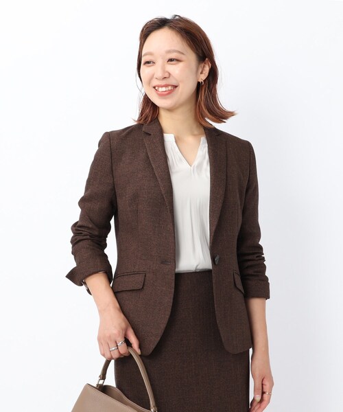 【デザイン】 秋に適したシャークスキンが存在感を放つテーラードジャケットです。 すっきりとしたきれいなシルエットなので、どんなボトムにも合いやすいジャケットです。 袖口を折り返してすっきり着こなすのもおすすめです。 こちらの商品はセットアップでご利用いただけます。 パンツ:検索番号153-63313 スカート:検索番号153-73313 ※ポケット数:横×2、内側×1 【生地感】 ポリエステル素材のウール調合繊素材を使用しています。 ウールのような膨らみ、暖かみがあるタッチと表情にしています。 滑らかな肌触りの裏地付きなのもうれしいポイントです。 こちらの商品は主に秋に着用いただける商品です。 モデル情報:身長157cm着用サイズ:02(M) 店舗へのお問い合わせ商品番号:153-43313 ●製品寸法: 01(S):着丈57cm B88cm 袖丈58cm 肩幅37cm 02(M):着丈58cm B93cm 袖丈58cm 肩幅38cm 03(L):着丈59cm B96cm 袖丈59cm 肩幅39cm 備考:重量:02(M)約360g