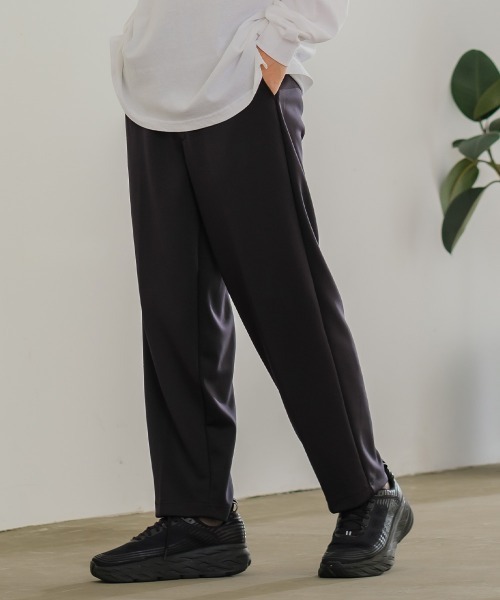 “とろみ”がクセになるダイバー素材のワイドパンツ。 テロンとした滑らかな肌触りに、もちっとした触感が特徴のダイバー素材を使用し、見た目も着用感もしなやかで、ほんのり艶感もある上品できれいな表情をまとった一本。 効果的なストレッチ性、脚通りの良いスムースさと、着心地だって抜群にイイ。 そんな“とろみ”素材にワイドシルエットも相まったオチ感シルエットもまた今の温度感。 スタイルは、きれいめな印象のワンタック仕様のスラックスで、腰ゴム、ウエストにコードが内臓されたイージーパンツスタイルは、楽ちんな履き心地でフィット調整も簡単なうえ、ベルトなしでの着用も可能。 カジュアルからきれいめにも対応するシンプルなデザインはコーデにも取り入れやすく、別売のモックネックカットソーやクルーネックのトップスと合わせるとセットアップも楽しめます。