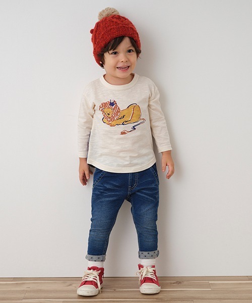 はき慣れたような色落ち加工にユーズド感がただようロングパンツです。裾をロールアップすると星柄プリントが現れて、着こなしに可愛らしいアクセントをプラス♪ 伸縮性に優れたニットデニム素材とソフトなミニ裏毛仕様で着心地も抜群です。ウエストはお着替えが簡単に行えるリブ地で切り替えました。【おすすめの着用時期は秋シーズン】【透け感】透けない【生地の厚さ】普通【伸縮性】あり【裏地】なし【ポケット】あり【アジャスター】なし