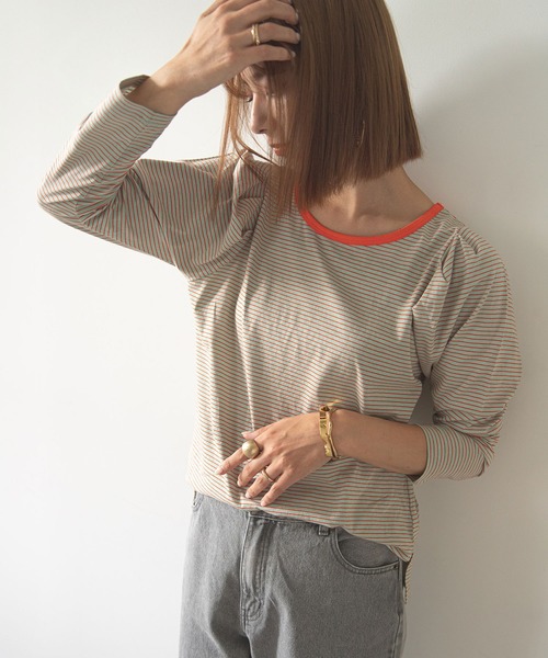 タックスリーブがポイントの細ボーダーカットソー 【ディティール】 ●片面にセンターシームがあり、気分に合わせて前後2WAYで着用可能 ●タックの入ったパワショルデザインで女性らしさをプラス ●細ボーダーなのでカジュアルになりすぎず、きれいめにも着て頂けます ●デコルテをきれいに見せてくれる広めのクルーネック ●サイドスリット入り 【ボーダー配色】 カーキ: ブラウンがかったカーキ×ブルー ミント: くすみミント×オレンジ サックスブルー: サックスブルー×レッド 【コーディネート】 襟ぐりのカラーバインダーがポイントになってくれるので、カーデのインナーとしてもおすすめ! ごわつかないライトな素材感なので、ジャンスカやキャミワンピースなどのインナーとしても活躍します。 ********************** 透け感:なし 裏地:なし 伸縮性:ややあり 光沢感:なし 生地の厚さ:普通 ********************** ※ご覧のモニター環境や撮影環境により実際の商品と多少色味が異なって見える場合がございます。 ご理解の程よろしくお願いいたします。 【お買い物をよりお楽しみいただく為に】 ▼商品のお気に入り登録をおすすめします ♡をクリックしてください。 完売カラーの再入荷や、ラスト1点の通知、 セールの際の通知を受ける事ができます。 ブランドのお気に入り登録もご一緒にお願い致します。