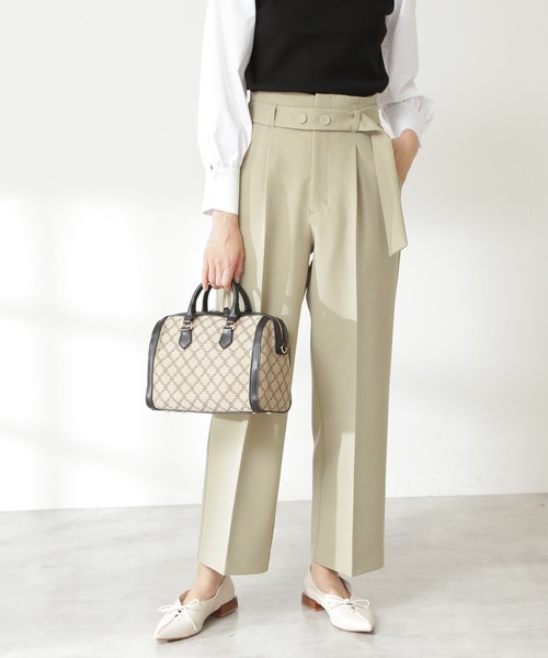 釦付ウエストベルトがアクセントになるストレートパンツ。共布ベルトにボタンを施し、お腹まわりがすっきり見えるデザインです。 ややハイウエストの後ろはゴム仕様なので、トップスインを上品に見せてくれます。 脚のラインをキレイに見えるようセンタープレスを施し、オンにもオフにもキレイめな印象で着られます。