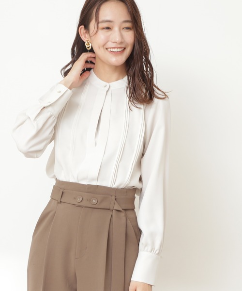 タックプリーツを贅沢にあしらったブラウス。肌さわり滑らかなとろみ素材を使用した、着心地の良い風合いです。前立てのタックプリーツが高級感のあるアクセントになり、ボトムインを品よく見せてくれます。首元のプチ釦やカフスを長めにとった細かいディテールもさりげないポイントです。スカートにもパンツにも合わせられるので、ワードローブに揃えておくと重宝します。