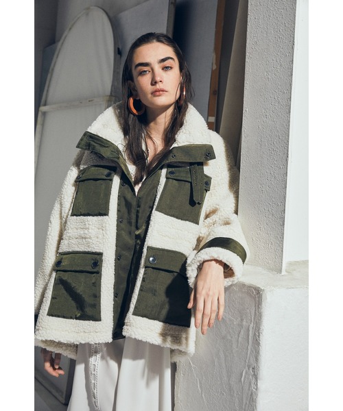 EZUMi定番のボアジャケット。 ウール混のあたたかなボア素材をベースにしたジャケット。 今季はヨーロッパのヴィンテージ ミリタリーのエッセンスを取り入れて登場。 裾に向けてAラインに広がるオーバーシルエットで、厚手のニットの上からも着られるゆったりとしたサイズ感。 ウエスト内側のドローコードでウエストシェイプの調整が可能。 厚手のナイロン素材で切り替えたスタンドカラーのダブルベルト、前後6つのフラップ付きアウトポケットなど、 機能とデザインを兼ね備えたアイテムです。