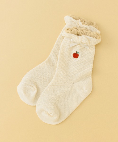 愛らしいオーラたっぷりのリンゴ刺しゅうとリボンを添えたクルーソックスです。 全体にあしらった繊細な模様編み、ふっくらとしたはき口フリルでドレッシーな雰囲気も♪ ボトムのレングスに左右されにくい、使いやすいクルー丈も魅力のひとつ。SS、Sサイズのみ足裏にはすべり止めプリントつきです。刺しゅうの裏に「あて布」はございません。