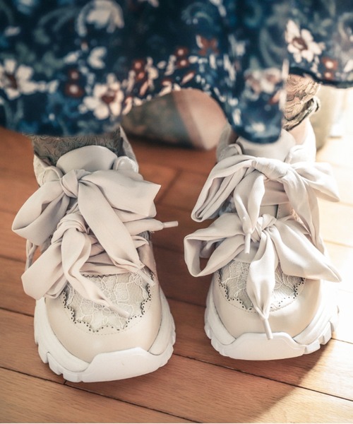 【アイテム説明】アッパー部分は同色レースと合皮のスカラップ、サイドにリボンテープを使用してフェミニン×スポーティーを叶えたスニーカーです。厚底はトレンド感と歩きやすさを両方兼ね備えています。2段リボンも素材でカジュアルさを出し、幅広いコーディネートに合わせやすく仕上げました。チュールのスカートや、チュニック×レギンスとの組み合わせがおすすめスタイル♪