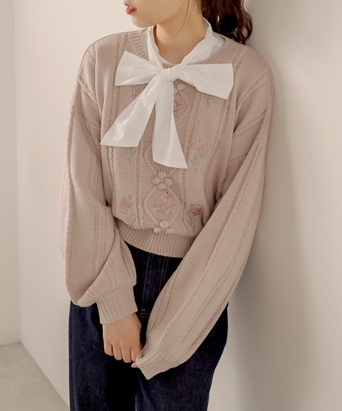 ヴィンテージ感たっぷりの花刺繍がかわいいケーブルニット登場! ランダムなケーブル編みと、くすみカラーがポイントの花刺繍が古着っぽい印象。 WEB限定アイテムで登場 ■デザイン ・程よく袖のボリュームも可愛らしいフォルムに。 ・可愛いお花デザインならコーディネートが一気に華やかな印象に。 。 ・丈も長すぎないので、ボトムを選ばないデイリーアイテムに♪ ・淡いカラーの花刺繍で可愛いコーデのポイントに。 ■スタイリング ・ミニボトム以外にもマーメイドスカートやカラーパンツと合わせてカジュアルダウンしても◎ ・ジャンパースカートとのレイヤードもおすすめです。 ・レースブラウスなどのレイヤードコーデもガーリーな古着っぽくまとまります○ ----------------------------- 裏地:なし 光沢感:なし 透け感:なし 伸縮性:あり ----------------------------- model:166cm 着用サイズ:FREE ※引っかけ注意 ・粗い組織のものや、表面に凹凸があってルーズな組織のもの 表面に糸が浮き出ているものは、ちょっとした不注意から引っかけてしまいがちです。 取り扱いの際は取り扱い絵表示確認の上、十分注意してください。 ・着用時にベルトや、バックや周囲の壁など表面の粗いものとの摩擦や引っかかりに注意してください。 ・水洗いやクリーニングの際にも他の物ものとの引っかかりに注意して下さい。 ※着用、お取り扱いの際は、商品についている品質表示とアテンションタグを必ずご確認下さい。 ※ご覧のモニター環境や撮影環境により実際の商品と多少色味が異なって見える場合がございます。 ご理解の程よろしくお願いいたします。