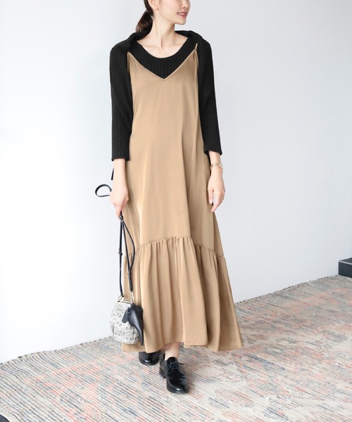 裾切り替えのフレアデザインが今年らしいキャミソールワンピース。 華奢な肩紐とすっきりとしたVネックが大人な印象に導きます。 インナーにニットを合わせたり、上からジャケットを羽織るだけでもこなれ感のある着こなしに。 ゆとりのあるシルエットで気になるボディラインをしっかりカバーしてくれます。 生地は肌馴染みの良いソフトな風合いで、合わせ次第でロングシーズン着用できる万能アイテムです。 詳細情報 厚み:□薄手 ■普通 □厚手 透け感:■なし □あり(アイボリーのみややあり) 光沢感:□なし ■ややあり □あり 伸縮性:■なし □あり 裏地:■なし □あり カラー展開 アイボリー、ベージュ、ゴールド、ブラック(黒) インフォメーション 【商品のお気に入り登録】 再入荷通知やラスト1点の通知、セール情報を受け取ることができます。 【ショップのお気に入り登録】 新商品や再入荷、お得な情報などを受け取ることができます。 ELFRANK ELFRANK(エルフランク)は、「Elegant(上品・優雅)」×「Frank(気さくな・身近な)」をキーワードに、 ライフスタイルに寄り添った新しいカジュアルスタイルを発信するブランドです。 日常のディテールにこだわり、自分らしさを楽しみ磨き上げていく... そんな女性に向けて、等身大の美しさと憧れを表現したファッションアイテムを提案します。