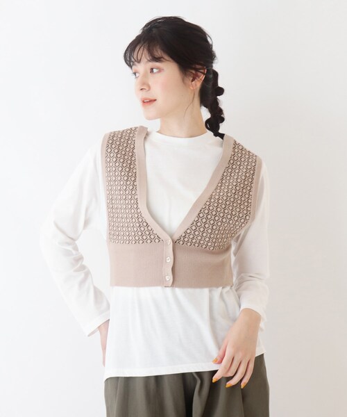 【デザイン】トレンドのニットビスチェとインナーのロンTがセットになったお得なアイテム。コーデに悩まず一気にスタイルが決まります!今年注目のジャカード柄でトレンド感たっぷりのアイテムです♪【生地感】しっとりした風合いが心地よいジャカードニットはフラットな仕上がり。Tシャツは薄すぎず厚すぎず、一枚でもレイヤードでも重宝まちがいなしです。※複数枚のセット商品のため、洗濯表示・注意事項等は、本製品で御確認下さい。【サイズ】小さいサイズSサイズあり。#CutieBlonde#Cutie#cutieblonde#cutie#キューティブロンド#キューティ#20代#30代こちらの商品は主に秋に着用いただける商品です。モデル情報:身長168cm B75 W60 H87 着用サイズ:02(M)店舗へのお問い合わせ商品番号:256-13005●製品寸法:01(S):ニット着丈39cm ニットB70cm ニット肩幅34cm インナー着丈57cm インナーB98cm インナー袖丈52cm インナー肩幅43cm02(M):ニット着丈41cm ニットB73cm ニット肩幅36cm インナー着丈59cm インナーB102cm インナー袖丈53cm インナー肩幅45cm03(L):ニット着丈42cm ニットB76cm ニット肩幅37cm インナー着丈61cm インナーB106cm インナー袖丈54cm インナー肩幅46cm備考: