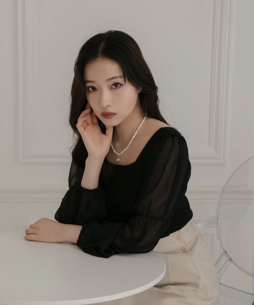 身頃がニットで、袖がシアー生地のデザイントップス。首元がスクエアに開いているので、 ネックレスやチョーカーを合わせるのもおすすめです。
