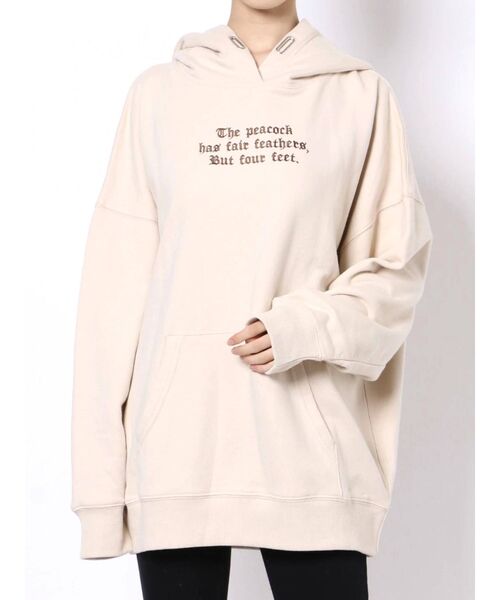 フロントのグラフィック刺繍がポイントのオーバーサイズフーディです。 着丈も長めなのでチュニック丈で着用できます。 意味:人は見かけによらない。(綺麗な羽を持つ孔雀も、足元は汚れている)
