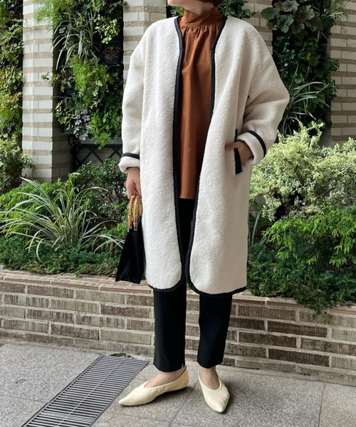 カジュアルなタウンユースにぴったりなボアコート ●デザイン ちょっとしたお出かけにおすすめのアウターが登場! 後身頃にはエコバックを入れられる大きさのポケット付き、前身のポケット袋布の裏側にはカードやカギを入れられるようにファスナー付きの内ポケットがついているのも嬉しいポイント。カジュアルになり過ぎず大人女子にもぴったりなデザインです。 ●おすすめコーディネート デニムはもちろん、今期はレザーアイテムなどと合わせを楽しむスタイリングもおすすめ。 ●素材 本体:ポリエステル100% 配色部分:ナイロン100% ・軽くて温かな素材感 洗濯方法:ドライクリーニング 透け感:なし 裏地:なし 伸縮性:なし 生地の厚さ:普通 光沢:ややあり ファスナー:あり ポケット:あり 【スタッフ着用コメント】 《AYANO》 身長:158㎝/普通/普段サイズ:M/着用サイズ:F Vのネックラインと、黒のパイピングが引き締め効果をプラスしてくれるので、着膨れしてみえないボアコート。 アームホールもゆとりがあるので、厚手のトップスも余裕を持って着れました◎ 158cmでも膝上の着丈なので、パンツ、スカート、なんでも合わせられるところも魅力です。 ============================== 【注意点】 ※画像の商品は光の照射や角度、お使いのモニター環境により、 実物と色味が異なる場合がございます。 あらかじめご了承下さいませ。 ============================== 【お買い物をもっと便利に楽しく♪】 『♡』をクリックでお気に入り登録 ・「商品のお気に入り登録」で・・・ ラスト1点や再入荷の通知が届きます。 登録して頂いた商品だけが対象となる、あなただけのタイムセールが開催されることも! ・「ブランドのお気に入り登録」で・・・ 新商品や再入荷など、いち早くブランドのお得な情報を受け取ることができますので、ご登録をおすすめします! ==============================