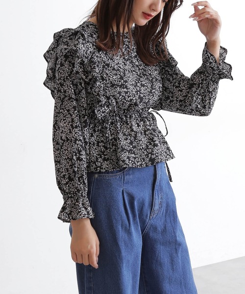 甘すぎないフリルディテールを取り入れた花柄ブラウス。肩と裾の控えめなフリルの分量と2配色のシンプルな花柄で仕上げました。サイドリボンでウエストをシェイプし、腰が隠れるペプラムのようなシルエットで着心地も抜群です。フェイクレザーボトムやカジュアルなパンツスタイルと合わせるのがオススメです。