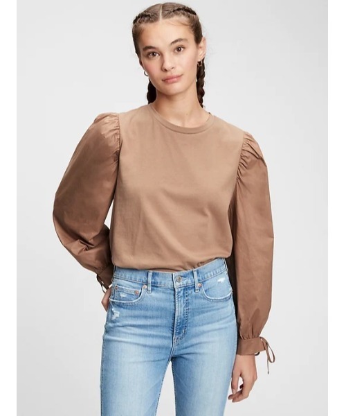 ボディ部分は柔らかなニット、袖に布帛生地を使用長袖、肩周りにシャーリング入り、リボンで絞れる袖口クルーネック※商品タグに記載の価格とサイト上の販売価格が異なる事があります。【Gap ギャップ】1969年にアメリカ・サンフランシスコで創業以来、世界的なカジュアルファッションブランドとして、常にモダンなアメリカンカジュアルを提案し続けています。<価格改定のお知らせ>2022年1月20日(木)から、原材料価格の上昇などにより価格を変更させていただきます。お届けする商品についているタグが旧価格の場合もございますが、サイト表示の価格が販売価格です。予めご了承いただきますよう、お願い申し上げます。