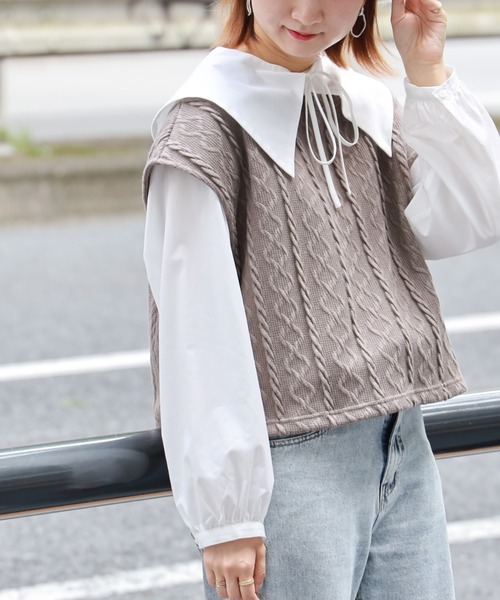 ニット×シャツx付け衿が3点セットになった3セットスリットベスト。 単品でもそれぞれ活躍する万能トレンドアイテムです。 それぞれのアイテムをお手持ちのお洋服と組み合わせるなどコーデの幅も広がります。 リラックス感のあるレイヤードスタイルが簡単に叶います。 【ニット】 着丈:M/50 L/52 身巾:M/112 L/58 【付け衿】 前衿:18 後衿:18