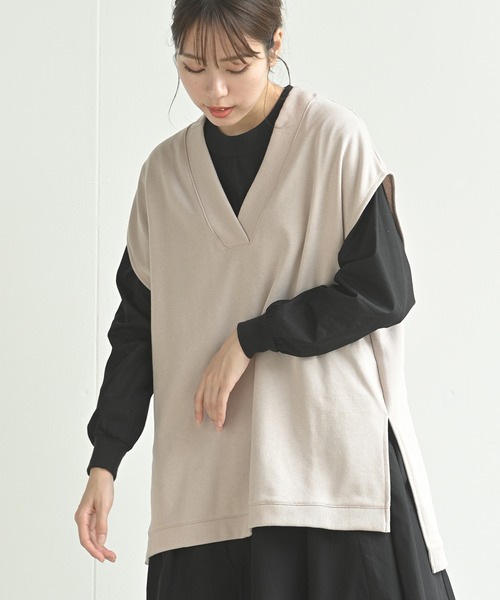 どんなスタイルにもマッチするシンプルベスト普段使いにぴったりなスウェットベスト。シンプルなデザインでどんなシーンでも活躍してくれます。メンズライクなゆったりサイズでスタイリングに抜け感をプラス。ルーズなレイヤードがお楽しみいただけます。深めのVネックと裾はリブ切替でラフな印象に。裾は段差をつけてこなれた感のあるコーデに仕上げてくれます。裏地なし伸縮性弱い薄手織キズやだま等みられる場合もございます洗濯:洗濯機使用可(ネット使用)