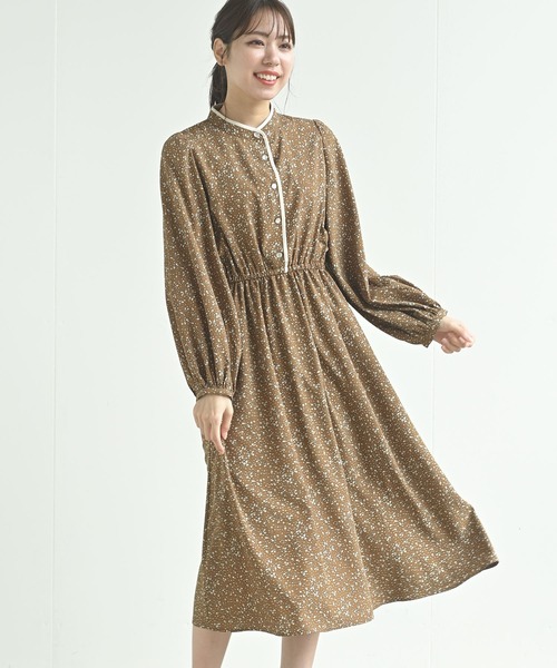 品が良く存在感もあるレトロフラワーワンピース すっきりとしたデザインと品の良さが魅力のアンティークワンピ。 ヴィンテージライクなフラワープリントが存在感を与える1枚です。 襟と前立てに配色のパイピングをあしらってきちんと感をプラス。 ウエストはゴムで絞って女性らしいブラウジングシルエットを描きます。 ふんわりしなやかなスリーブラインがクラシカルな印象に。 この1枚で大人ガーリーなワンピスタイルが楽しめます♪ ウエストから下裏地あり 伸縮性なし 薄手 胸元ボタン開閉 プリンとむら等みられる場合もございます 洗濯:手洗い可
