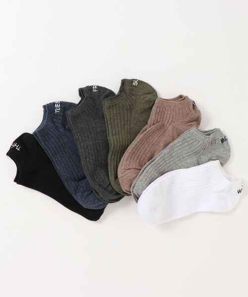 お財布に優しいお手頃価格で毎日のコーディネートが楽しめる! 曜日のロゴがワンポイントで入ったMonday~Sundayまでの1週間分の7足セットソックス。 スニーカーに合わせやすいショート丈の靴下です◎ ※注意事項※ ・こちらは7足セットでございます。 ・生産時期により色味や柄が若干異なる場合があります。 ・記述寸法より多少の差がある場合がございます。 ・ご覧いただいているパソコンや携帯電話等によっては、 製品の色が現物と違って見える場合がございます。 予めご了承くださいませ。 【商品のお気に入り登録】 商品のお気に入り登録をすると、 完売カラーやサイズの再入荷通知や、 ラスト1点のリマインド通知、 セール情報などをいち早くお届けします! 【ショップのお気に入り登録】 ショップをお気に入り登録すると 新商品の発売や再入荷、クーポン発行通知、 タイムセール情報など ショップのお得な情報をいち早くお届けします! 是非、ご登録ください!
