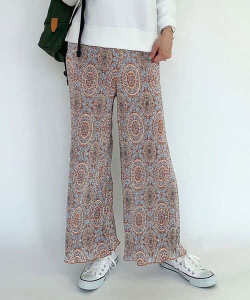 ストレスフリーで足長に見えるオリエンタル柄プリーツパンツらくちんでかっこいいスタイルを完成させるワンマイルリゾートパンツ スタイルがよく見えて、ウエストゴムのらくちん仕立てで、さらっとした素材+プリーツで体へのはりつきを軽減した総柄プリント。シンプルなTシャツ、ロンTに合わせたり、シャツやブラウスとの相性も抜群。 トップスをウエストインしてコンパクトに見せ、ハイウエストな雰囲気で着るとスタイルアップが叶います。 ■point 履くだけで一気にハンサムスタイルになり、色づかい、柄行きともに派手すぎず柄物に抵抗がある方にオススメの商品です。 ワイドストレートな形を落ち感ある素材にプリーツ加工を入れて縦長に見える効果を強調しているので、かなりスタイルアップして見えます。長めのトップスとのレイヤードにもおすすめです。 ■detail ウエストゴム仕様。ワンサイズでおおよそ身長160センチが基準のフルレングスのパンツですが、身長150センチくらいの方はウエストを折り上げて調整できるので、スニーカーコーデも可能です。らくちんなので、おうちでも重宝します。 ■fabric ポリエステル …………………… 透け感:なし 裏地:なし 伸縮性:なし 光沢感:なし 生地の厚さ:薄い 洗濯方法:※詳しいお手入れ方法は商品タグをご参照ください …………………… ■coordinate サンダル合わせだとリゾートが感出ます。スニーカーでカジュアルに、お出かけ向け