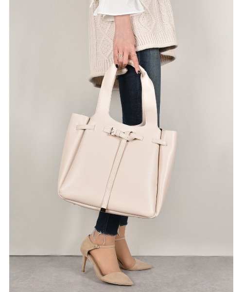 【TVドラマ衣装提供商品】 フロント部のベルトデザインがポイントなトートバッグ。 一枚革風の生地を使用し、ふんわりとしたシルエットに仕立てました。 持ち物の整理がしやすいように内側はあおり仕様の3層構造になっており、A4サイズ収納対応なので通勤・通学などのデイリーユースにぴったり。 底鋲がしっかり4か所についているため、床に直置きしても底部が汚れにくいのもうれしいポイント。 シーンを選ばない定番のブラック、ニュアンスカラーがかわいいグレージュ、取り入れるだけでコーデが明るくなるアイボリーの3色展開です。 ※外側…ポケットなし 内側…あおりオープンポケット×2,オープンポケット×2,ファスナーポケット×1 ※ファスナー開閉仕様 ※ベルト部分は装飾となります。バッグの口元を調節するためのものではございません。 ※撮影環境により、実際のカラーと異なる場合がございます。 また、ご覧いただく環境(携帯やスマートフォン、パソコンなどの画面)と実物では色が異なって見える場合がございます。ご了承の程お願いいたします。