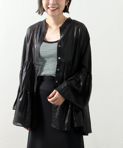 フェミニンさがありながらも大人っぽく着ていただけるティアードブラウス。 チンツ加工が施されていて、レザーライクな素材感が特徴です。 程よいふんわり感とボリューム袖が動くたび女性らしい印象になります。 またシワになりにくく、ホームケア可能なところも嬉しいポイント! ※取り扱いについては、商品についている品質表示でご確認ください。 ※店頭・外での撮影画像は、光の当たり具合で色味が違って見える場合があります。 商品の色味は、スタジオ撮影の画像をご参照ください。 モデルサイズ:身長:161cm バスト:80cm ウェスト:58cm ヒップ:88cm 着用サイズ:フリー 本体:手洗い可能、ウォータースポット、デリケート製品(薄手の製品、シルクなど)