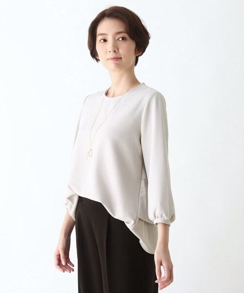 【デザイン】後ろにティアードのデザインが入った七分袖プルオーバー。シンプルさ、上品さ、フェミニンさがそろったバランスのよいデザインは、通勤からお出かけまで着まわしが利いてなにかと重宝まちがいなしです。シンプルさに引き立つ、存在感のあるネックレスが付属していますから、ON/OFFで表情を変えてお楽しみいただけます【生地感】伸縮性のある斜め畝素材を使用。サラッとした揺れ感と、しなやかな中肉感をそなえたソフトジャージ風生地で、上品さとらくちんをバランスよくかなえます。【サイズ】大きいサイズ(LL)の展開あり。※04(LL)サイズはWEB限定サイズです。こちらの商品は主に秋に着用いただける商品です。モデル情報:身長165cm B80 W60 H86 着用サイズ:02(M)店舗へのお問い合わせ商品番号:741-13321●製品寸法:02(M):着丈62cm B98cm 袖丈46cm 肩幅35cm 付属ネックレス全長70cm 付属ネックレスモチーフH4cm 付属ネックレスモチーフW4cm03(L):着丈63cm B103cm 袖丈47cm 肩幅36cm 付属ネックレス全長70cm 付属ネックレスモチーフH4cm 付属ネックレスモチーフW4cm04(LL):着丈64cm B108cm 袖丈47cm 肩幅37cm 付属ネックレス全長70cm 付属ネックレスモチーフH4cm 付属ネックレスモチーフW4cm備考: