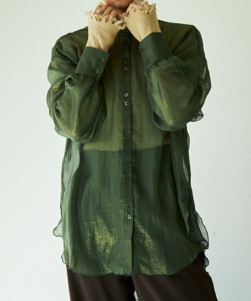 - 2021 VACANCY PRE FALL COLLECTION -◆トレンドのシアー素材に秋らしい色合いのバンドカラーシャツ【特徴】今期のトレンドのシアーシャツに秋らしいカラーを加えたシャイニーシアーバンドカラーシャツ。動くとキラッとする光沢のある素材が華やかな印象ながら軽い着心地で羽織りとしてもトップスとしても着回しが可能です♩さらっとした生地の揺れ感とバンドカラーで首元に丸みのあるデザインなのでシャツスタイルでも女性らしい雰囲気を演出できます。【スタイリングポイント】シアーの素材を活かしてインナーはキャミソールやタンクトップで程よく肌見せするのも◎秋冬にかけてはTシャツやカットソーをレイヤードしてモードライクな着こなし方もオススメです♩・・・・・・・・・・・・・・・・・・・・透け感:あり裏地:なし伸縮性:なし光沢感:あり生地の厚さ:薄い・・・・・・・・・・・・・・・・・・・・【お買い物をお楽しみいただく為に】▼お気に入り登録をオススメ致します▼♡をクリックして下さい。・《商品のお気に入り登録》で再入荷通知や、ラスト1点の通知、セールの際の通知も受け取ることができます。・《ブランドのお気に入り登録》で新作商品や再入荷など、お得な情報を受け取ることができます!【ATTENTION】 ※画像の商品はサンプルです。実際の商品と色味、仕様、加工、サイズ、素材等が若干異なる場合がございます。※撮影場所やお使いのモニター環境により若干お色味が異なる場合がございます。※製品によっては染料の特性上、湿った状態や汗をかいた状態での長時間の放置、または摩擦により、他のものへ色移りする恐れがありますので、着用時にはご注意下さい。 ※お洗濯は洗濯ネットを使用し、他のものとの混合洗いはお避け下さい。色落ちや色移りの原因となります。 タンブラー乾燥はお避け下さい。 ※風通しがよく、湿気の少ない日の当たらない場所で保管して下さい。 ※また製品加工上、お手元に届く際に匂いが生じる場合がありますが、 ご使用を続けていく事により匂いは軽減されます。※ご注文いただいた予約商品のお届け時期の確認は、注文履歴ページより行えます。