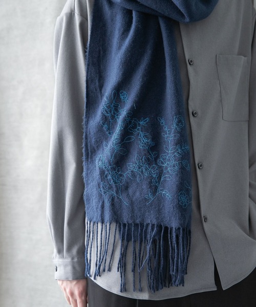 HAREらしい刺繍をあしらった大判ストール。先端部分に刺繍を施したデザインストール。シックな配色で刺繍を施し、モードスタイルに合うアイテムです。生地はやや薄めなので、ぐるぐるラフに巻いてボリュームを出したり、1重で垂らして使うなど、お好みに合わせて楽しめます。