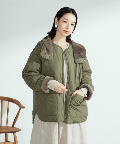 ◆ONIGIRI(おにぎり)の <リバーシブル> タフタ×ファーブルゾン◆ 《素材》 タフタ素材と、ファーボアの軽やかなキルティング素材。 両面を楽しめるリバーシブル仕様。 タフタはやや光沢感のある素材なので、 カジュアル過ぎず、上品な印象。 片面は密度があるファーで、 ふんわり柔らかくあたたかな素材です。 中綿は、デュポン社が開発した 「ソロナ」という素材を使用しています。 「ソロナ」は植物性由来で、環境と地球に優しい中綿。 軽量で保湿性が高いのも特徴です。 《デザイン》 ゆとりのあるサイズ感の、ノーカラーブルゾンです。 リバーシブルなので、素材の異なる両面を、 着ていくシーンやスタイリングに合わせて使い分けられます。 ボトムを選ばずにヒップ周りをカバーする、程よい着丈。 裾部分はゆるやかなラウンドヘム。 また、フードの取り外しができるので、 付けたり外したり、リバーシブルで着たりと、 4WAYの着こなしが楽しめます。 …………………… 透け感:なし 厚さ:厚い 伸縮性:なし 光沢感:ややあり 裏地:リバーシブル ポケット:あり 洗濯方法:洗濯可 …………………… ※画像の商品はサンプルとなりますので実際の商品と仕様、加工、サイズが若干異なる場合がございます。 ※こちらの商品はFIVE FOXes独自の採寸方法となっています。 本サイトのサイズガイドと採寸方法が異なる場合がありますのでご了承ください。