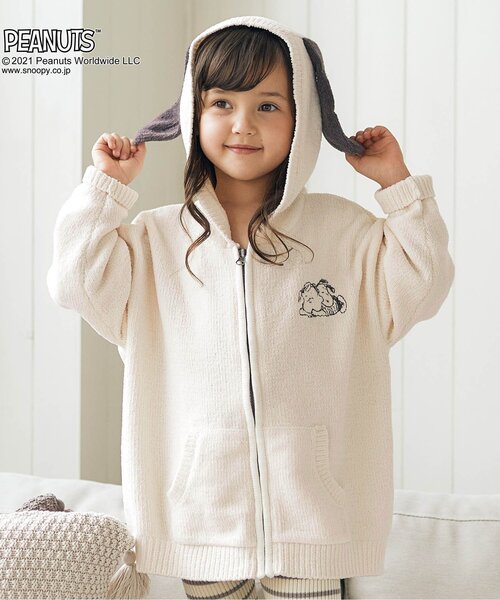 ふわもちしっとりな触り心地が気持良いモールニットを使用。 おうち時間にはもちろん、おそとでの羽織としても。 フードにはスヌーピーの黒いお耳付きで被るととってもかわいいデザイン! 胸元にはチャーリー・ブラウンとスヌーピーが仲良くお昼寝をしている刺繍が。 対応サイズ 90cm:80~90cm 100cm:90~100cm 120cm:110~120cm 130cm:120~130cm