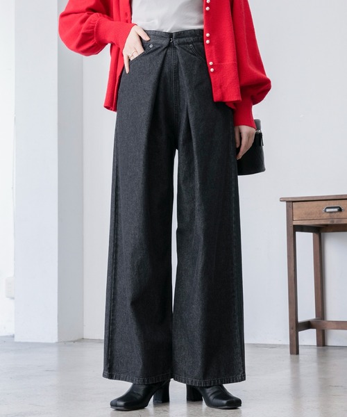フロントタックがアクセントになった、大人のデニムワイドパンツ ■デザイン フロントに深いタックを施したワイドデニムパンツが登場。 ややハイウエストでスッキリとした腰回りから、裾にかけて落ち感のあるワイドシルエットが脚長効果を演出します。 気になるヒップラインもしっかりカバーしてくれ、スタイルアップが叶います。 ワイドながら縦のラインを強調したデザインは、大人っぽく洗練された印象に。 カジュアルなデニムパンツですが、細部のデザインに拘っているのでモード感もあり、シンプルなトップスとも相性抜群。 程よい厚みの生地なのでシーズン問わず着用いただけます。 ウエスト内側部分の左右のボタンを留め、最後にフロントのホックを留めていただく2段階仕様が特徴。 内側のボタンがしっかりとホールドしてくれるので、ウエスト位置がずれにくく快適な穿き心地に◎ ■スタイリング ハイウエストかつラインの美しいパンツなので、トップスをインしたりショート丈のロンTと合わせたりして着用いただくのがおすすめです。 ウエスト周りのタックを見せることで、モード感がプラスされ大人女性を引き立てます。 もちろんオーバーサイズのTシャツやスウェットとの相性も抜群。 カットソー×スニーカーでカジュアルに決めても、シャツ×ミュールで大人可愛く仕上げても◎ シンプルなアイテムなのでどんなトップスとも合わせやすく、ロングシーズン着用いただけます。 ■POINT ・フロントタック×ハイウエストで美脚効果あり ・ゆったりとした着心地でおうち時間にも最適 ・ポケット付き ・程よいホールド感で、快適な穿き心地 ・センタープレスが入ったような美シルエット ※屋外での撮影画像は、光の当たり具合で色味が違って見える場合がございます。 また、ご覧になっているデバイスやモニター環境によって、実際の色味と多少異なって見える場合がございますので予めご了承をお願い致します。 ≪お買い物をお楽しみいただくために≫ ▼商品のお気に入り登録 完売カラーの再入荷通知や、ラスト1点の通知、セールの通知も受け取ることができます。 ▼ブランドのお気に入り登録 新商品や再入荷等、いち早くブランドのお得な情報を受け取ることができます。 ※取り扱いについては、商品についている品質表示でご確認ください。