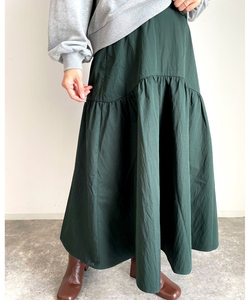 WEB限定 ほんのり光沢のあるナイロン混素材で仕立てたロング丈のスカート。 ハリ感のある生地がふんわりとしたシルエットをキープ。 裾へ向かって広がるラインが体型カバーを叶えてくれます。 バックウエストはゴムになっているので着心地も快適。 トレンドのショート丈トップスにもバランス良く合わせられます。 季節感をプラスできる落ち着いたカラーがラインナップ。 ・バックウエストゴム 【以下グリーン参考。カラーにより多少の誤差あり】 ・透け感:透けない(表地) ・伸縮性:なし ・生地の厚さ:薄い ・裏地:あり