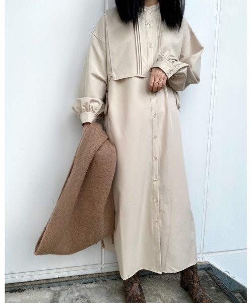 すとんとしたシルエットでこなれ感たっぷりのスタイルが完成するロング丈のシャツワンピース。レイヤード風のデザインに胸元のピンタックがクラシカルなアクセントになっています。サイドのリボンでシルエットの微調整が叶うのも◎。やわらかな生地で着心地も快適です。ウエストマークでメリハリシルエットで着こなすのもおすすめ。【以下グリーン参考。カラーにより多少の誤差あり】・透け感:透けない・伸縮性:なし・生地の厚さ:薄い・裏地:なし