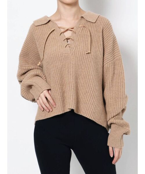 トレンドの襟付きショートニットです。 フロント部分にはフェイクスウェードテープでレースアップをデザイン。 ショート丈ニットなのでハイウエストボトムとも合わせやすいシルエットがうれしい1枚です。