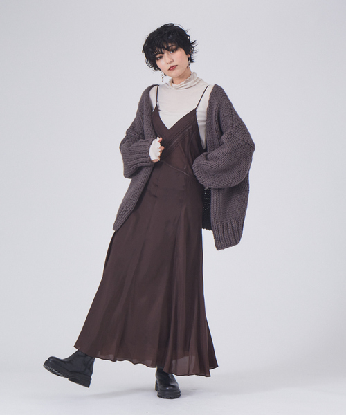 *POINT*華奢なシルエットや繊細なディテールで女らしさのあるキャミドレス。ほんのりセンシュアルな雰囲気が大人な雰囲気を演出します。*DESIGN*切り替えにレースを挟み込み、千鳥ミシンをアクセントに施した手の込んだディティールが特徴。落ち感のある素材なのでストンと落ちるシルエットですが、三角マチを入れ裾にボリュームを持たせているので動いたとき、綺麗に広がるフレアシルエットが女性らしい印象です。ウエストから下は裏地が付いているので一枚で安心して着て頂けます。ストラップ部分は、片結びで長さの調整が可能です。*COORDINATE*キャミワンピースとしてインにタートルニットやカットソーを合わせたり、上からスウェットやオーバーサイズニットを重ねてスカート風にアレンジしたりと、着こなしの幅が広いアイテム!さらっと上からカーディガンを羽織った、艶っぽいスタイリングも◎なやかで薄手のキュプラ素材を使用。艶やかな光沢感が、秋冬スタイルを軽やかに仕上げます。こちら手洗いが可能です。