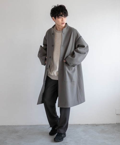 ◆素材ウールの様な表情や膨らみ感のある風合いを化合繊のテクノロジーを駆使して開発した多機能素材。中空ポリエステル繊維をブレンドして軽く仕上げ、ニードルパンチ加工で膨らみ感を持たせ空気を含むことで暖かさも兼ね備えます。原料にリサイクルポリエステル繊維と環境配慮型レーヨンを一部使用する事で環境と人にやさしい素材を使用しています。 ◆デザインパイピングをアクセントにしたオーバーサイズシルエットのスタンドカラーコート。太めに設定したワイドスリーブは袖口のアジャスト釦で調整が出来るので、シルエットに変化が付けられます。 ◆スタイリングオーバーサイズ&ドロップショルダーで落ち感のあるシルエットなので、リラックスした着心地です。ロング丈のTシャツやスウェットなど、BIGシルエットのトップスでカジュアルに着るのがおすすめ。