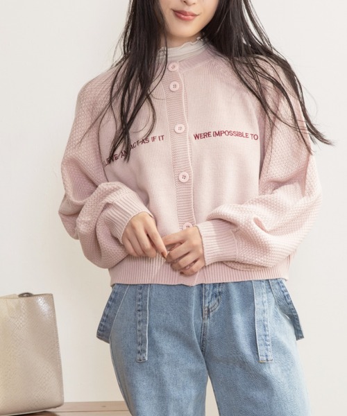 カジュアルかわいいショートカーディガン♪<MATERIAL>アクリル素材の柔らかニットリブ部分は伸縮性があります。自宅でお手入れしやすいアイテムです。<DESIGN>ワイドな身頃にボリューム袖、ショート丈とトレンド感あるシルエットのカーディガン。ラグランスリーブとロゴ刺繍でカジュアルデザインに♪秋冬に着回しやすい豊富なカラバリに、配色になったロゴ刺繍がポイントになっています!ショート丈なので、定番のハイウエストボトム合わせでスタイルアップ◎ビッグカラーブラウスを中にレイヤードしたり、シアートップスを重ね着するとよりトレンド感あるコーデに。カジュアルなデザインのニットですが、あえてガーリーなワンピースの上から羽織るのもおすすめ♡シンプルながらも古着っぽい雰囲気があり、プルオーバーとして使っても、カーディガンとして使ってもコーディネートをおしゃれ見せしてくれるアイテムです♪刺繍:BIGボタン:ビッグ釦:ワッフル:鹿子:天竺:バルキー:ゆるだぼ:ピンク:グリーン:ガーリー:重ね着<CARE>※詳しくは製品に付属している洗濯表示をご参照ください。※撮影環境により、多少実際のカラーと異なる場合がございます。 また、携帯やスマートフォン、パソコンなどの画面上と実物では多少色が異なって見える場合がございます。