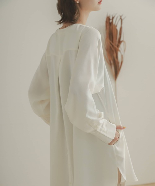 レイヤードで使えるアイテム バックタックとボタンディテールのデザインがレイヤードで引き立つブラウス 〇ヒップが隠れるチュニック丈 〇一枚でもレイヤードでも使えるシンプルデザイン 〇バックのタックとボタンディテールがこなれ感を演出 styling ルーズなチュニック丈のブラウスです。クルーネックでシンプルなデザインですが、後ろのボタンタックが存在感のあるアイテムになっています。ショート丈のニットと合わせて、ディテールを見せるコーデがおすすめです。 ※商品画像は、光の当たり具合やパソコンなどの閲覧環境により、実際の色味と異なって見える場合がございます。予めご了承ください。 ※商品の色味の目安は、商品単体の画像をご参照ください。 ----------------------------- 透け感 : ややあり(IVORYのみ) 伸縮性 : なし 裏地 : なし 光沢 : ややあり ポケット : なし ----------------------------- ▼お気に入り登録のおすすめ▼ お気に入り登録商品は、マイページにて現在の価格情報や在庫状況の確認が可能です。 お買い物リストの管理に是非ご利用下さい。