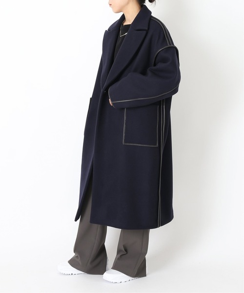 【2021AW】CITYSHOP◇◇前年人気のコートが新色展開で今年も登場!◇◇メンズライクなチェスターコートの型をベースに、アウトシームにパイピングを施して大人の印象に仕上げたコート。パイピング部分は柔らかなフェイクレザーで、様々な角度から見てもさりげなくポイントになるデザイン。程よくワイドなシルエットで、少し厚みのあるインナーでもラインが響かず着て頂けます。今シーズンは人気のネイビーに加え、ベーシックに着まわせるブラックを加えた2カラーでご用意しました。ミドル丈でアクティブに動きたい日の羽織りやすさもありつつ、程よい大人見えも叶えてくれるアウターです。**********************透け感:なし裏地:あり伸縮性:なし光沢感:なし生地の厚さ:厚い**********************【スタッフ着用コメント】《スタッフ》身長:160cm/普段サイズ:M/着用サイズ:フリーサイズ感:私の身長で着丈は太ももにかかるくらいで、ゆとりをもって着られるサイズ感でした。身幅も袖幅も広めなので、ローゲージのニットの上でも楽に着られそうです。素材感:ウールベースの厚みのある素材です。パイピングはフェイクレザーです。着心地:しっかりとした厚みで暖かく、シーズン通して着られそうです。丈が長すぎないので裾を気にせず動きやすいのも良いです。ロング丈が苦手な方にもおすすめです。**********************※取り扱いについては、商品についている品質表示でご確認ください。※店頭及び屋外での撮影画像は、光の当たり具合で色味が違って見える場合があります。商品の色味は、スタジオ撮影の画像をご参照ください。