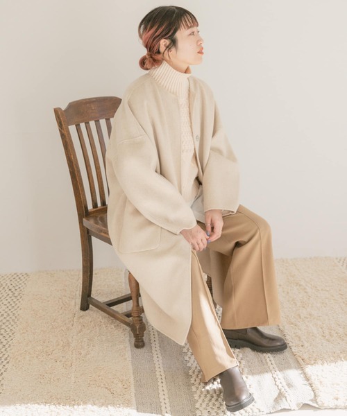 羽織るだけで大人っぽく決まる、高級感漂うリバー仕立てのコートが到着。2枚の布を1枚に縫い立てることで、軽くてふんわりとした柔らかな着心地と保温性の両方を叶えました。滑りの良い袖通しと、着崩れを防止してくれるのも注目したいポイント◎ノーカラーで抜け感を出しつつ、マフラーやストール、タートルネックやハイネックを合わせやすいディテールに仕上げました。 ----------------------------- 《スタッフ着用コメント》 [スタッフA] 年齢 : 20代後半, 身長 : 163cm, 体型 : 普通 普段の着用サイズ : M 【着用サイズ】FREE 【サイズ感】ゆったりした作りですが、生地自体にそれほど厚みがないので太って見えるような印象はありません。163cmスタッフが着用し、ちょうど脛の中間ほどの丈です! 【素材感, 着心地】オーバーサイズのデザインと広いアームホールのおかげで窮屈さとは無縁なので、インナーに着るアイテムの幅も無限大です! 【その他】首回りのおしゃれも楽しむことができ、インナーも選ばないアウターなので、冬には大活躍間違いなしです◎ [スタッフB] 年齢 : 30代前半, 身長 : 160cm, 体型 : 普通 普段の着用サイズ : M 【着用カラー/サイズ】OFF/FREE 【サイズ感】オーバーサイズでゆったりと着用できますが、ノーカラーですごくスッキリとした印象で着られます◎160cmでひざ下くらいです。スカートでもワイドパンツでも合わせやすそうです◎ 【素材感, 着心地】そこまで厚みのないウール素材なので、とでも軽い着心地でした! 【その他】首元がもたつかないため、マフラーを合わせたりフードのトップスと合わせたり、1枚あると便利なアウターです! [スタッフC] 年齢 : 20代後半, 身長 : 152cm, 体型 : 普通/骨格ストレート 普段の着用サイズ : トップスS~L/ボトムスS 【着用カラー/サイズ】BRN/FREE 【サイズ感】152cmで膝下になる丈感のアウターです!長すぎないので低身長でも着用しやすくバランスが取りやすいです◎袖は落ち感があるシルエットなので分厚めのインナーを着てももたつかないです! 【素材感・着心地】滑らかな質感で、肌触りが気持ち良いです◎ウールが入っていますが、チクチク感がなく軽い着心地です!! 【その他】どんなコーディネートにも合わせやすいアウターなので万能に着回せます! ----------------------------- 総重量 : 約955g ※ピリング(毛玉)が出来たら、引っ張ったりして取ろうとせず、ブラッシングするか毛玉取り器や小さなはさみなどで、ひとつひとつ取り除いてください。 ※1日着用したら2日休ませるなど、ローテンションを考えて着用して下さい。 ※その他お取り扱いに関しましては、商品に付属のアテンションタグをご覧ください。 ※商品画像は、光の当たり具合やパソコンなどの閲覧環境により、実際の色味と異なって見える場合がございます。予めご了承ください。 ※商品の色味の目安は、商品単体の画像をご参照ください。 ----------------------------- 透け感:なし 伸縮性:なし 裏地:なし 光沢:なし ポケット:あり -----------------------------