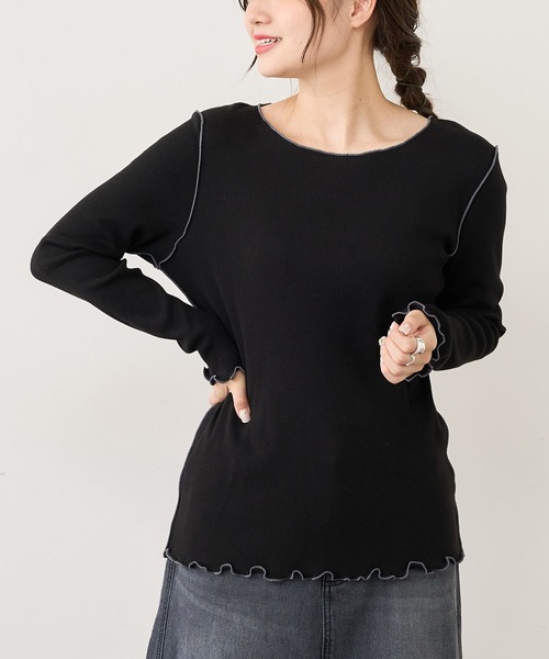 ピュアルセシン 2021 autumn&winter collection【sophisticated retro】 ◇レイヤードスタイルに欠かせない、メロウプルオーバー◇ ●デザイン 毎シーズン大人気なメロープルオーバーが 今季はWEB限定カラーを含めて登場です。 小ぶりなフリルのようなデザイン感が、 コーディネートにさりげなく、華やかさをプラスしてくれます。 胸元は開き感のあるクルーネックになっており、小顔効果も◎ 程よくフィット感のあるサイズ感で、レイヤードスタイルでも スッキリとした印象に。 襟ぐり、袖口、身頃のセンターライン、裾にメロー加工が施されており、 「大人可愛い」を演出してくれます。 ●カラー展開 (通常カラー)キナリ/クロ (WEB限定・配色ステッチ)キナリ×グレーモカ/クロ×グレー の計4色展開。 ●素材 薄手で柔らかなコットン100%素材。 リブ素材でストレッチが強く、動きやすい質感です。 ●スタイリング トレンドのレイヤードスタイルが楽しめます。 前開きのシャツやブラウスのインナーに。 スウェットやニットと重ねて、襟・袖・裾をチラ見せしてワンポイントに。 サロペットやキャミワンピースのインナーとしても◎ ボトムスを選ばず、気分に合わせてコーディネート出来ます。 柔らかな生地感なので、ボトムスのイン・アウトはどちらでもOK。 ============================ 透け感:キナリのみややあり 裏地:なし 伸縮性:あり 光沢感:なし 生地の厚さ:薄手 【スタッフコメント】 年齢:30代前半/身長:156cm/普段着用サイズ:Lサイズ サイズ感:程よくフィット感があります。 袖もメロー加工になっているので、スウェットなどの袖口から メロー部分を覗かせたら可愛かったです。 襟ぐりの開きは、鎖骨がしっかり見えるくらいです。 素材感:コットン100%です。とても柔らかく伸縮性があります。 ============================ ※撮影場所やお使いのモニター環境により若干お色味が異なる場合がございます。特にロケの撮影では明るく見える傾向にございます。 ※予約商品はサンプルで撮影をしております。若干の仕様が変更になる場合がございますので予めご了承の上ご注文くださいますようお願いいたします 。