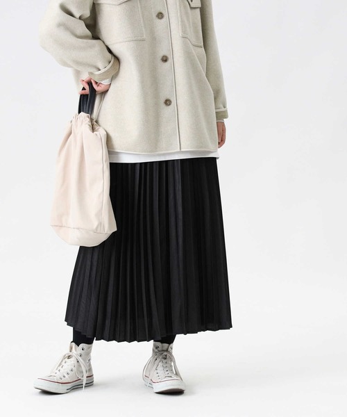 まるでレザーのような光沢感なのに、ゆるりと軽く、気楽に穿けるオシャレなプリーツスカート。柔らかい光沢とプリーツ加工がポイント。ミドル丈のシャツなどと合わせて綺麗めなトレンドスタイルも◎!Tシャツやスニーカーと合わせたカジュアルなスタイルにもマッチします。トップスを選ばず、スッキリと着られるので手軽に使えて着回し効果も抜群のアイテムです。この1着で旬なコーディネートを素敵に簡単に楽しめます。さらにオールウエストゴムで穿きやすいのもポイントです♪