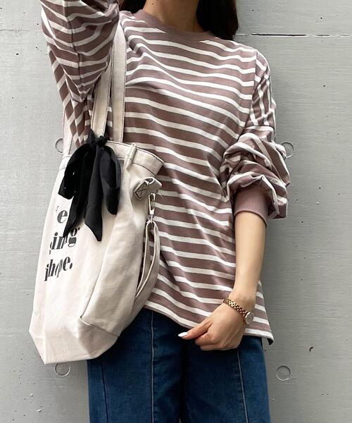 2021 秋アイテム デイリー使いに大活躍間違いなしのボーダーTシャツ。トレンドのゆったりシルエットでラフ&カジュアルに着られる1枚に仕上げています。ふんわりとしたボリュームスリーブでガーリー要素をプラス。伸縮性のあるやわらかな生地で着心地も快適です。サイドスリットを大きく入れているのでフロントインスタイルで着こなすのもおすすめ。・スリットあり【以下オフホワイト/ラベンダー参考。カラーにより多少の誤差あり】・透け感:やや透ける・伸縮性:あり・生地の厚さ:薄い・裏地:なし