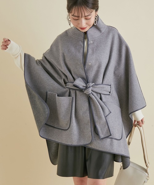 パイピングデザインがアクセント!【デザイン・シルエット】 裏地を付けずに軽い着心地のポンチョ。 裏地で滑らないのでポンチョの形でもしっかりと身体にはまります。 襟はスタンドにして、前を開けて着たときにも襟がずれたりしないのがうれしい仕様に。 スタンド襟は顎に付かない高さにしているのと襟下がりも通常より深くしています。 ウエスト部分はベルトを通してキュッとマークする事も出来るようにしました。 またパイピングで華奢で柔らかいイメージになるようにしました。 ライトグレーには黒の合皮、ベージュはアイボリーの合皮を使用しています。 【素材】 フェイクウールのジャージー素材を使用。 【カラー】 大人なライトグレーと柔らかなベージュの2色展開。 【おすすめのスタイリング】 デニム×ブラウスの上から羽織るスタイルがおすすめ。 ニットのタイトスカート×ハイネックプルオーバー×ブーツの合わせもおすすめです。 ----------------------------- 裏地:表前脇部分のみあり 光沢感:なし 透け感:なし ポケット:なし 伸縮性:なし 生地の厚さ:中肉 ボタン:隠しスナップボタンあり その他仕様:袖下スナップボタン留め 季節: ----------------------------- 【モデル着用サイズ】 全色モデル身長:160cm、着用サイズ:F ※画像の商品はサンプルです。 実際の商品と仕様、加工、サイズが若干異なる場合がございます。