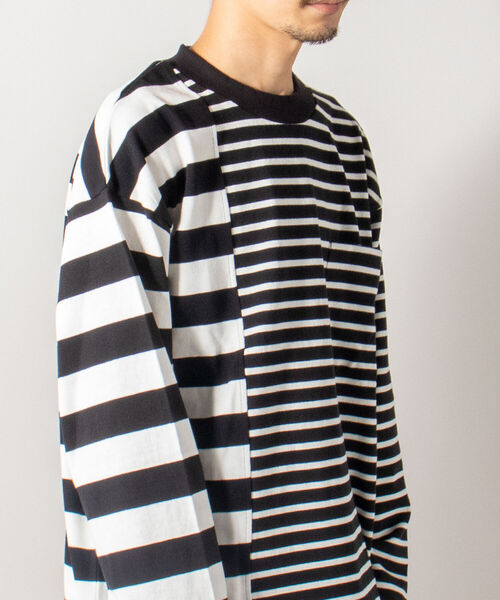 2種類の異なるピッチのボーダー生地を組み合わせたロンT。 角度によって違った見え方をする面白い1枚です。 ゆったりめなシルエットと、肌触りの良いコットン100%素材で着心地も快適。 大きめな胸ポケットと配色の太めのリブ衿も特徴です。 他に無いデザインと存在感ある見え感の1枚は、ぜひ今秋トライしていただきたいおすすめアイテムです。 【生地感】 -------------------------- 透け感:なし 裏地:なし 伸縮性:適度にあり 光沢感:なし 生地の厚さ:やや厚手 -------------------------- 【スタッフ着用コメント】 身長:170cm/体重:52kg/体型:細身/普段サイズ:M/着用サイズ:M スウェットとロンTとの間ぐらいの生地感で柔らかく、肌触りがいいです。 落ち着いた色味に遊び心あるランダムボーダーは「大人が似合うボーダー」だと思います。 【GLOSTER/グロスター】 『男性であること、女性であること、日本人であること、人間であること。』 自由に生きる為に必要な洋服であり、着る人を主体と考えたプロダクトを提案します。 普遍的な洋服の礎であるワーク・ミリタリーをベースにエッセンスとして艶を加えて形にします。 洋服の原型を生かしながらもひねりの効いた素材を使い、ディテールは歴史の焼き増しではなく新たな価値観を創造します。 ※お取扱い上のご注意 アテンションタグを必ずご確認の上、着用又はお取り扱いください。 ※店頭及び屋外での撮影画像は、光の当たり具合で色味が違って見える場合があります。 ※商品画像に関しては出来る限り忠実に表示出来るよう努めておりますが、お客様がご利用のモニターの設定及び特性により、実際の商品と比較し色味に若干の誤差が生じる場合があります。 ◇商品のお気に入り登録◇ 【お気に入りに登録】を是非ご活用ください。 再入荷の通知や、ラスト1点の通知、セールの通知がいち早く届きます。 ◇ブランドのお気に入り登録◇ 新商品や再入荷など、いち早くブランドのお得情報が届きます。