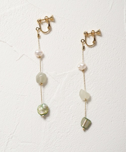 ゆらゆらと揺れるストーンモチーフのイヤリング。 程よいサイズ感で大人っぽく上品さを演出してくれます。 マーブル模様のストーンがこなれ感をプラス。 カジュアルにも綺麗めにも女性らしい印象を与えるデザインです。 ※ 撮影時の照明などの環境と、モニターに表示される色味がメーカーにより変わってしまう等の理由により、実際にお届けする商品と、ご覧になられているアイテムの色が若干異なる場合がございます。ご了承下さいませ。